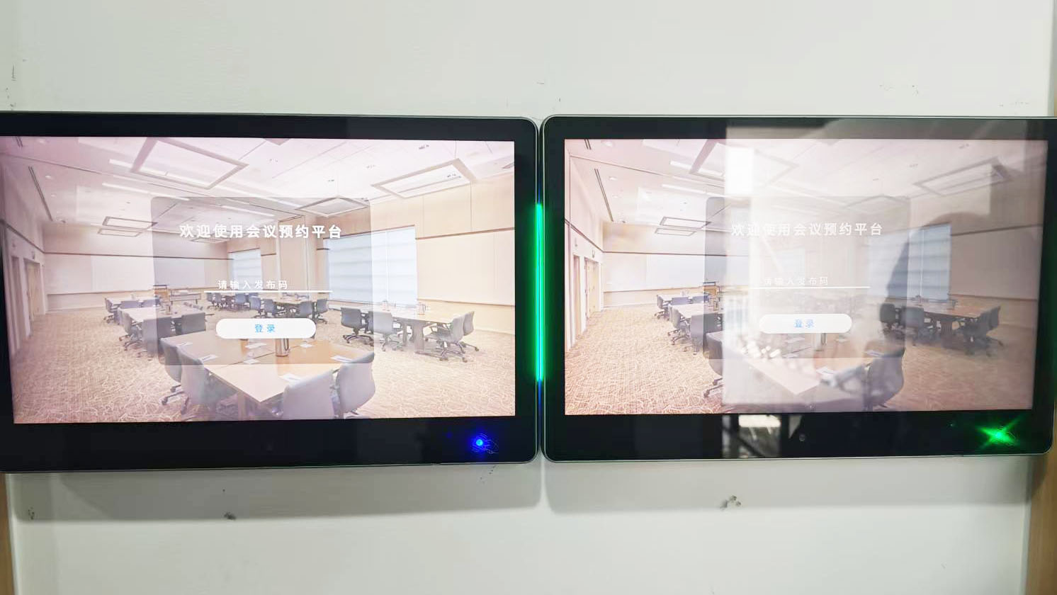 - 原有模式未配备人员签到功能,无法对参会人员到场情况进行有效记录与追溯,也未搭建专用的后台管理平台对会议室信息、使用权限、预约流程等进行统一配置、管理和运维,且会议室门口未部署专用显示屏幕,无法实时展示会议状态、会议名称及预约信息。